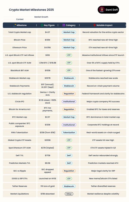 人们称2025年是加密货币的糟糕一年,他们忽略了实际发生的事情。 如果说2025年感觉混乱,那么从更宏观的角度来看,我们仍然见证了加密货币以五年前难以想象的方式闯入现实世界。 2025年加密货币主要里程碑👇