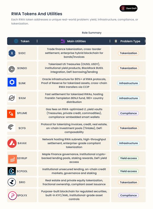按实用性分类的顶级RWA代币:它们的实际功能是什么? 以下是主要RWA代币创造实际价值的方式: $ XDC:贸易融资代币化、跨境结算、用于债券/发票的企业混合区块链 $ONDO:代币化美国国债(OUSG、USDY)、机构收益产品、与贝莱德Buidl集成、DeFi借贷 $LINK:为 80% 以上的 RWA 协议提供 Oracle 基础设施,支持代币化资产的储备证明机制,并通过 CCIP 实现跨链 RWA 转账。 $ XLM:快速结算代币化RWA,托管富兰克林邓普顿BENJI基金,覆盖180多个国家/地区 $PLUME:RWA优化L1、收益库(国债、私募信贷、大宗商品)、合规嵌入式智能钱包的Gas费 $ CFG:用于将发票、信用、房地产、链上投资池(Tinlake)和 DeFi 可组合性代币化的协议 $ AVAX:网络托管RWA子网、高吞吐量结算、企业级合规代币化 $SYRUP:Maple Finance 的治理、机构级加密货币抵押贷款池、质押奖励、DeFi 收益获取 $CPOOL:机构无担保贷款、链上信贷市场、治理和质押 $RIO:房地产和私募股权代币化、部分所有权、合规资产发行 $POLYX:专为受监管证券打造的区块链,内置 KYC/AML 功能,提供机构级资产控制。 每个代币都解决了一个特定的 RWA 问题:授权访问、基础设施、合规性或代币化。