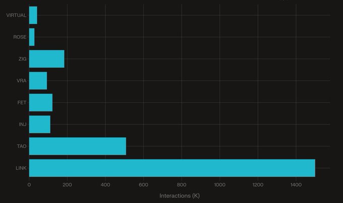 24小时内互动量排名前十的#AI项目 以下是社交互动方面领先的#AI加密货币: $LINK:1500K $TAO:508K INJ金额:111K $FET:122K $VRA:93K $ZIG:184K $ROSE:2.7万 #虚拟:41K $LINK 在人工智能社交领域占据主导地位,并大力宣传智能代理。 数据来源:LunarCrush