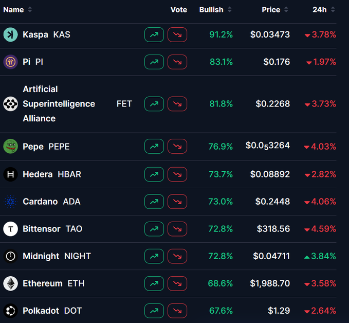 目前最看涨的情绪 民众已经表达了他们的意愿,以下是他们支持的: $ KAS:91.2% $PI:83.1% $FET:81.8% Pepe:76.9% $ HBAR:73.7% ADA:73.0% $TAO:72.8% $NIGHT:72.8% 以太ETH:68.6% $ DOT:67.6% 尽管价格全面下跌,但市场信心依然强劲。 这种在波动中展现出的韧性,正是底部得以形成的基石。 𝘋𝘢𝘵𝘢: 𝘊𝘰𝘪𝘯𝘔𝘢𝘳𝘬𝘦𝘵𝘊𝘢𝘱