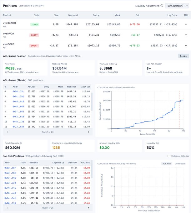 我们构建了一个仪表盘,旨在阐明 HIP3 市场上的自动清算机制,尤其是在 1 月底白银暴跌之后。 HIP3 的清算机制与常规 HL 市场不同。HIP3 没有备用清算金库,因此如果清算过程中账面流动性耗尽,则会直接进入自动清算系统 (ADL)。 -- 现在,HIP3 交易者可以: 计算每个仓位在 ADL 队列中的排名 - 在你之前有多少人被 ADL 清算 - 其他用户的名义资金量(蓝线) 查看可能触发 ADL 的价格 - 估算订单簿可以吸收多少清算 - 评估超出 ADL 范围的交易量(红线)
