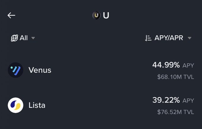 仅需 $U 即可获得 44.99% 的年化收益率 🚀 立即参与 @BinanceWallet 的 U Carnival 活动! twitter.com/VenusProtocol/stat...