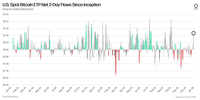 本周前两天(2026年1月4日至5日)比特币ETF的资金流入总量在其历史上排名第39位。 这个排名听起来可能不算*特别*高,但这是在498个交易日的历史总流入量中排名第39位,也是自2025年10月8日以来最高的两日流入量。