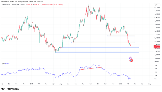 $ETH——即使我是长期看多,也还是找不到现在重新入场的理由。如果比特币已经跌破了四月的低点,那以太坊迟早也会跟着跌破。