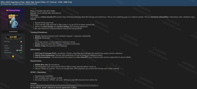 ‼️🇺🇸 一名威胁行为者正在以 100,000 美元(BTC/ XMR)的价格出售据称具有严重后果的 OpenSea 0-day 漏洞利用链。 攻击者声称该漏洞会影响 OpenSea 在以太坊主网、 Polygon和 Blast 上的 Seaport 订单验证逻辑,从而能够以 0 ETH 的价格强制转移高价值 NFT,绕过上架批准,并且对活跃和非活跃的上架商品均有效。 卖家声称该漏洞尚未修复且未公开。