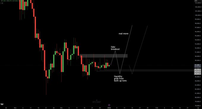 $BTC 假突破后回落,在真正行情到来之前吸收所有流动性,这将是一个理想的做多机会。话虽如此,任何对已形成低点的扫荡都是潜在的做多机会,我会密切关注。