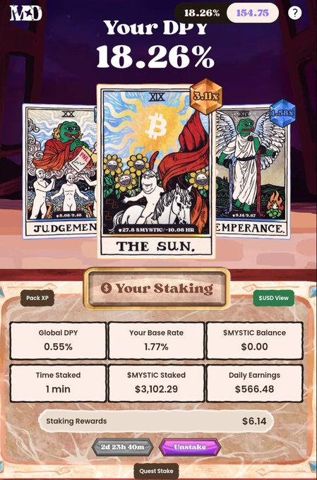市场波动剧烈 波动伴随著无聊。 不过,我仍然找到了一些有趣的机会,并且充分利用了它们。 能够与 @MysticDAO 合作,让我对游戏化的 DeFi 体验有了更深刻的理解。 博弈论非常精深。 - 质押代币 - 打开卡包 - 使用在产生一定收益后会被销毁的卡牌 - 使用负收益卡牌来维持优质卡牌,从而延长销毁时间 - 参与他们的幸运轮盘游戏 - 每周两次欢乐时光,您可以在这段时间内进行质押,锁定更高的 DPY… 在市场平静时期,一些最优秀的产品、DApp 和生态系统项目会涌现。 而这正是我真心享受参与与体验的项目之一。 游戏化 DeFi 的新玩法 如果