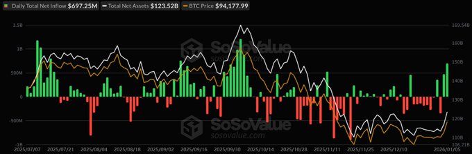 根据SoSoValue数据显示,1月5日(美国东部时间),美国现货比特币ETF则录得6.97亿美元的净流入。其中,贝莱德现货比特币ETF IBIT单日净流入额最高,达3.72亿美元。现货以太坊ETF录得1.68亿美元的净流入, Solana现货ETF…