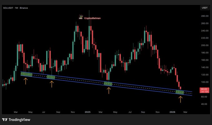 从更长的时间框架来看,$SOL 正在重新测试其巨大的下降上升趋势线。 这为什么重要?因为在过去两年中,价格每次触及该水平都会出现大幅反转。 让我们期待这次也能看到同样的反应。