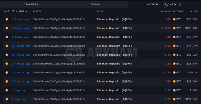 两小时前,巨鲸3NVeX继续向币安充值2,535枚代币(约合1.6842亿美元)。 过去三天,他总共向币安存入了 10,735 $BTC 约 7.2737 亿美元。 地址: intel.arkm.com/explorer/addres...… twitter.com/OnchainDataNerd/st...