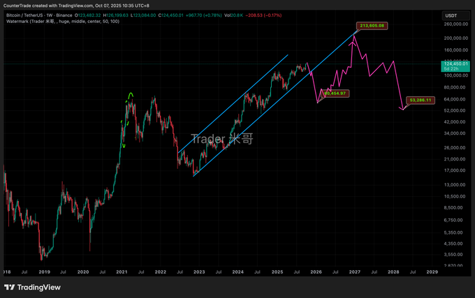 #BTC 抓住这波改变命运的波段。 2025年11月份前后完成一波50%跌幅的洗盘,这对牛市的前进很重要,因为这三年牛市中最大跌幅为33%,没有办法洗掉低倍杠杆。需要有一波去杠杆化的动作。 为什么11月份前后?因为11月份是4年周期的第3年,牛市走了三年了,很多人认为“这次不一样”,但是4年周期的烙印难以消退。11月份前后一旦开启大级别回调,就会造成很多人认为熊市要来了,会造成市场上的踩踏。 技术面上,周线级别通道(蓝色)之下有大量止损盘/恐慌盘待捕捉,跌破通道洗盘,明年牛市延伸到150-200k,然后26年底-27年开启一波熊市。200k跌到50k附近。 每次牛市,都有散户,都有大户,都有机构。只是每次牛市都会换一批人。都是同样的操作,同样的剧本,同样的庞氏。 保持警惕。 twitter.com/CryptosLaowai/stat...