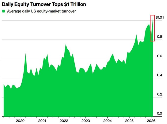 美国股市交易量刚刚创下历史新高,日成交额突破1万亿美元! 散户、基金和算法交易的参与度均显著提高,显示出强劲的市场动能。