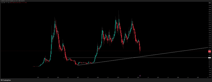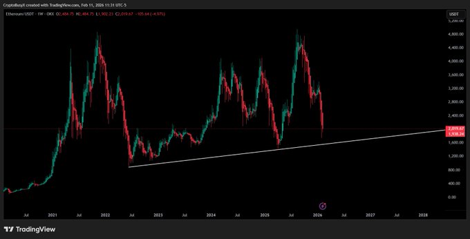 $ETH 目前处于重要的长期支撑位附近。 该区域将决定其下一步走势。 如果趋势线被突破,且周线收盘价强势跌破 1900 美元,则该支撑位结构将减弱。 这可能导致 $ETH 跌至 1600 美元附近,甚至可能跌至 1300 美元附近的流动性区域,这些区域也是历史支撑位所在。