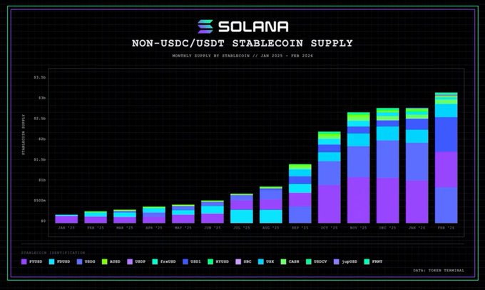 什么熊市? Solana $SOL 正在构建一个新的流动性引擎。 Solana上非 USDC 和非 USDT 稳定币的供应量已突破 30 亿美元! 这表明资金不再仅仅来自两种主要的稳定币。 新的发行人、新的资产和新的流动性来源正在进入生态系统。 这意味着更深的 DeFi 市场、更多的交易对以及更强劲的跨协议资金轮动。