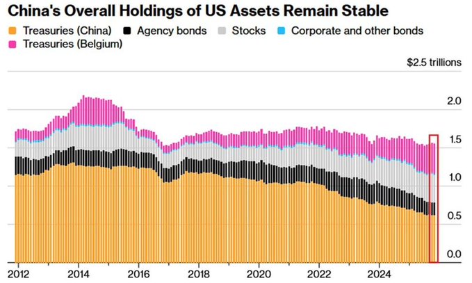 中国正稳步减持美国资产,降至多年来的最低水平🚨 这一转变表明,中国正逐步减少对美国国债的投资,并转向多元化投资。