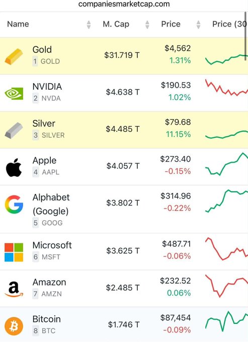 黄金和白银在短短6个月内市值增加了10.9万亿美元🚨 这相当于比特币目前总市值的六倍多。