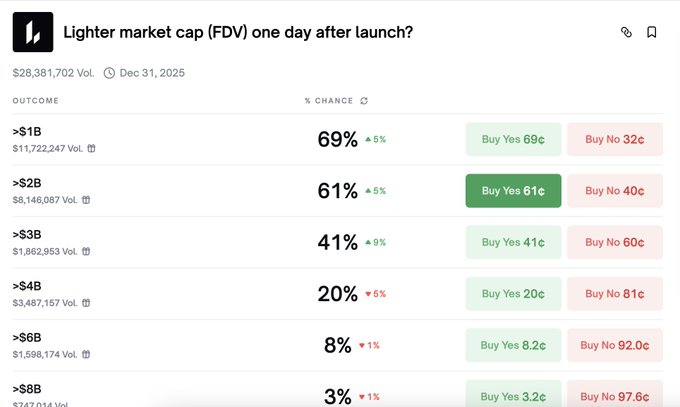 最近 $HYPE 回调很多,但 FDV 还是有 22.8B。 Polymarket 上认为 Lighter TGE 能冲破 3B 的,在过去 24h 内涨了9%,并且有超过 60% 的买盘认为TGE 后能站稳 2B FDV。 这是对 Perp 赛道最客观的预期了,大家都挺看好 Perp DEX 的前景。 #Web3 #Lighter #Polymarket #预测市场