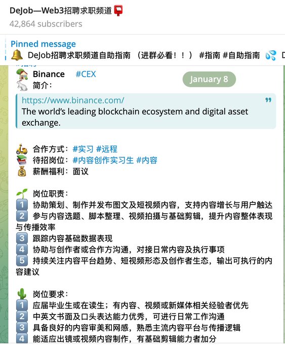 全球最大的加密货币交易所币安(Binance),正面向应届毕业生或在校生招聘内容创作实习生。与传统岗位不同,该职位采取远程办公模式。 币安的全球员工总数大致在 6000 名左右,分布在全球近 100 个国家和地区。 在员工绝对数量和覆盖国家维度上,都是全球整个科技行业中规模最大的远程办公组织。 #Binance @DeJob_Official #Web3