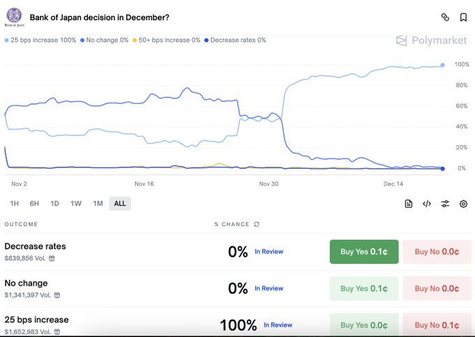 如何实现 Polymarket 上金融预测和 $BTC 间的信息套利? 拿今天日本央行宣布加息25个基点举例,Polymarket 上100%认为将会加息25个基点,此时押注已经没有利润。 预测市场往往比新闻稿快,当 Polymarket 达到 100% 预期时,说明市场已经完成了定价。甚至胜率超过 90% ,就可以视为 $BTC