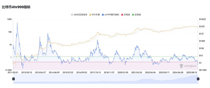 九神指数也要失效了。 可以看到 ahr999 囤币指标波动每轮牛市都在降低,随着大饼资金结构的转变,许多旧指标都没有那么准了。 这次价格见顶也就超过定投线一点点,刻舟求剑的话会很惨。 这次熊市抄底,恐怕也不能完全参考 ahr999 。