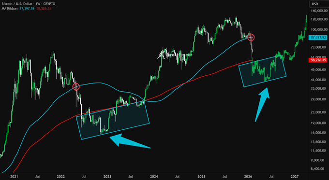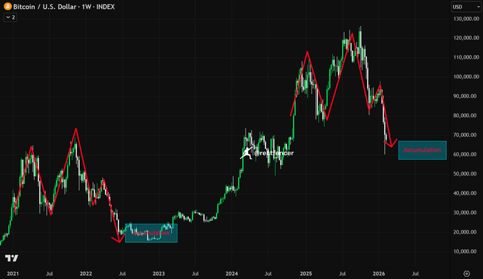 听我说,宏观级别的BTC走势总是如出一辙: - 斐波那契回撤完美对齐 - 200日均线失守 - 结构几乎是复刻 接下来就是一波残酷震荡,最后再来一次插针,最低到$45,000。 然后就只剩上涨模式了。