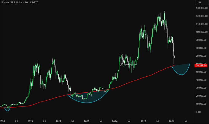 比特币上个周期曾跌破200周均线30%。 现在200周均线在$58,226。 高于这个位置的,都是溢价。