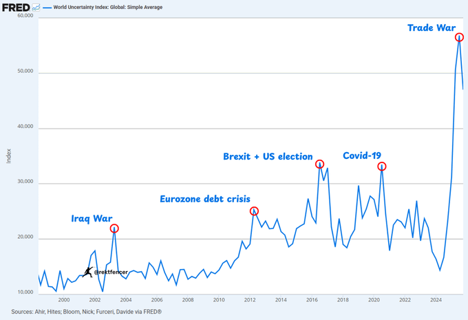 🚨 突发: 全球不确定性指数刚创下历史新高。 全球不确定性现状: 比伊拉克战争更糟 比欧洲危机更糟 比新冠疫情更糟