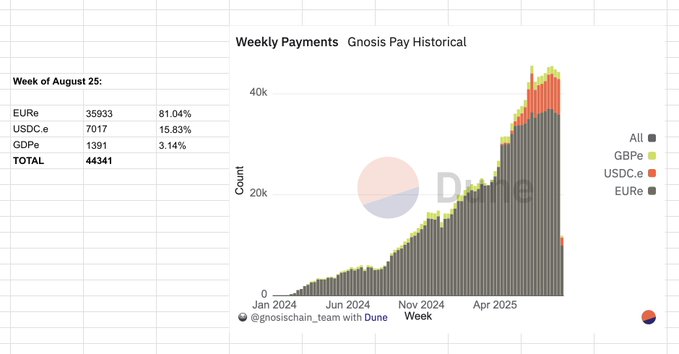 在短短 4 个月内,@gnosispay 上的USDC交易量从零增长到总额的 15% 以上,这要归功于在巴西的推出。 @usePicnic 是一位非常棒的合作伙伴! 另外,向 @fileverse 致谢,我喜欢贴上 Dune 连结并在 Sheets 中呈现图表的功能。 🙏