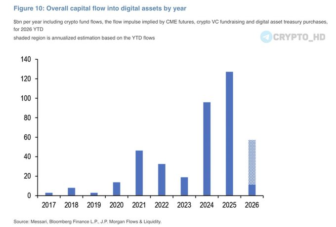 摩根大通表示,预计 2026 年第一季度流入加密的资金将仅达到约 110 亿镁(比去年同期低近次)。