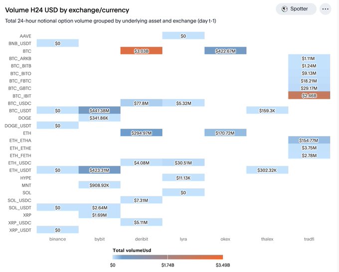 我非常肯定,无论是加密货币领域还是传统金融领域,都没有人拥有这种类型的分析工具。 IBIT 现在几乎占据了整个比特币期权市场 50% 的份额。 你最好也开始关注一下那里。