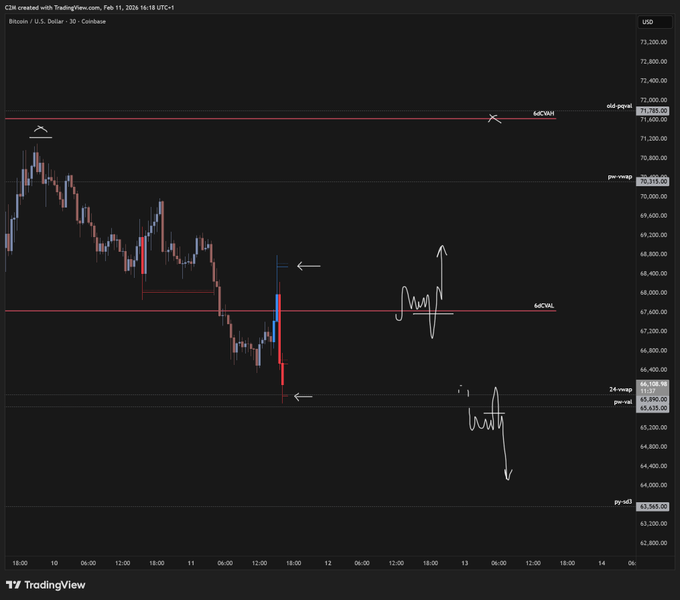 比特币这波从6dCVAL到pw-val的空单拿得非常干净,pw-val本来就是从71k做空的目标位。接下来有两个操作思路: 1. 如果价格重新回到CVA区间上方,可能会冲向6dCVAH更高的位置; 2. 如果跌破pw-val,就有机会继续下探py-sd3。 原推:twitter.com/c2mtrading/status/...