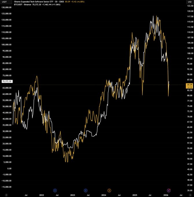 🤯 震惊!$BTC 竟然完美复刻了 iShares 科技软件 ETF ($IGV) 超过 5 年! 加密货币难道只是披着加密货币外衣的科技股?看看这张图表。 你的看法是——看涨还是看跌? #比特币 #加密货币 #投资