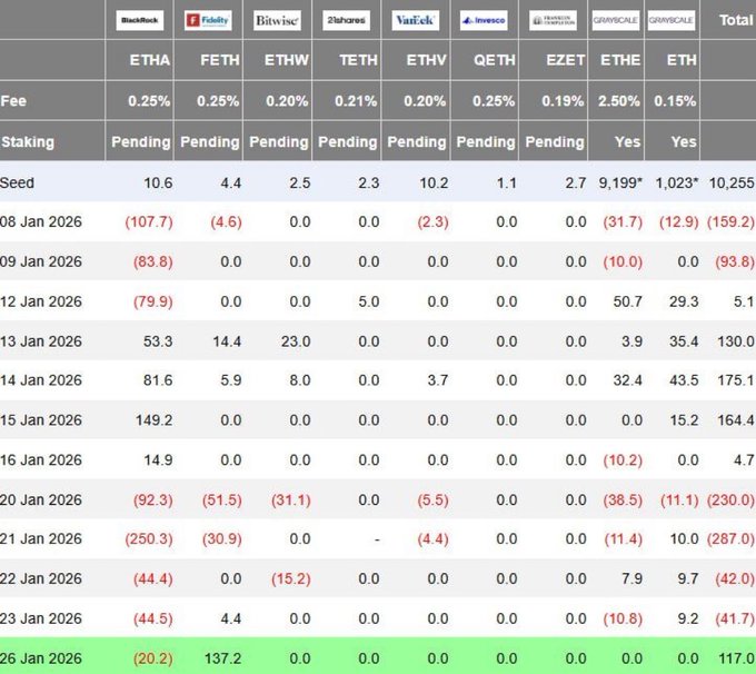 $ETH 昨日 ETF 资金流入 1.17 亿美元 🟢。 富达买入 1.372 亿美元 $ETH 继续上涨 💪🏻