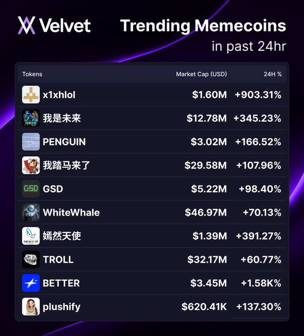 Velvet 平台十大热门 Memecoin 🦄 今日交易时段,$x1xhlol 位居榜首,24 小时内涨幅高达 +903.31%。 紧随其后的是 $我是未来,涨幅为 +345.23%。$PENGUIN 位列第三,然后是 $我踏马来了、$GSD 等其他 Memecoin 也位列其中。