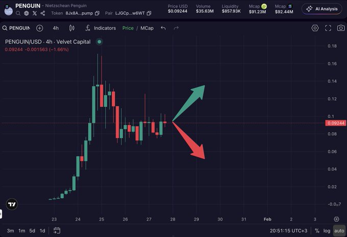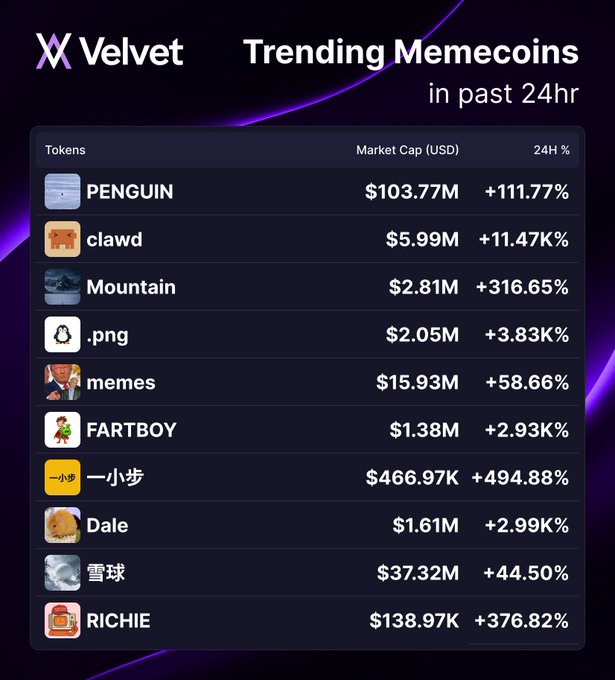 Velvet 24 小时最热门币种 🦄 今日榜首是 $PENGUIN,市值突破 1 亿美元大关,涨幅高达 +111.77%!🐧 紧随其后的是 $clawd,涨幅惊人,达到 +11.47K%!$Mountain、$.png 等币种也紧随其后。📈