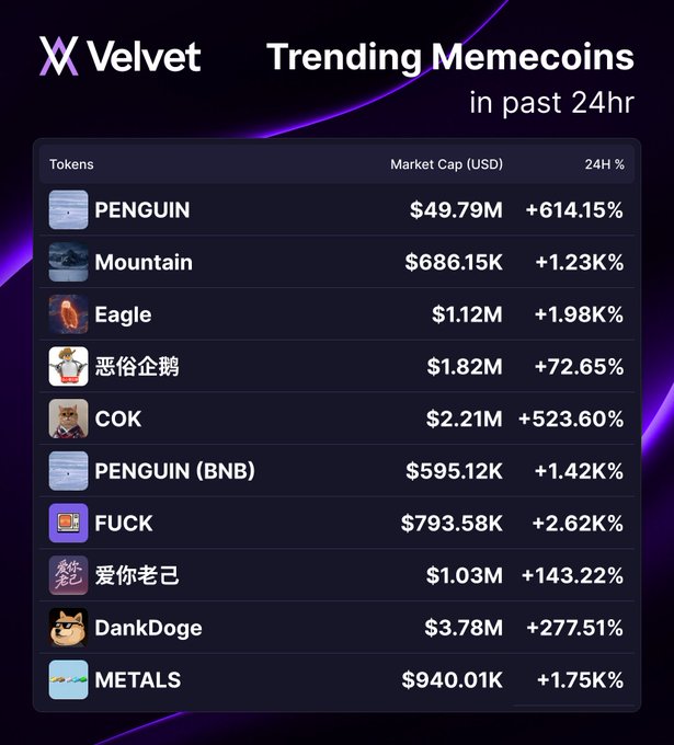 Velvet 24 小时最热门币种 🦄 今日领涨 Velvet 的 $PENGUIN 表现惊人,涨幅高达 +614.15%,市值突破 5000 万美元!🐧 紧随其后的是 $Mountain (+1.23K%) 和 $Eagle (+1.98K%)。$恶俗企鹅、$COK 等币种也紧随其后。🔥