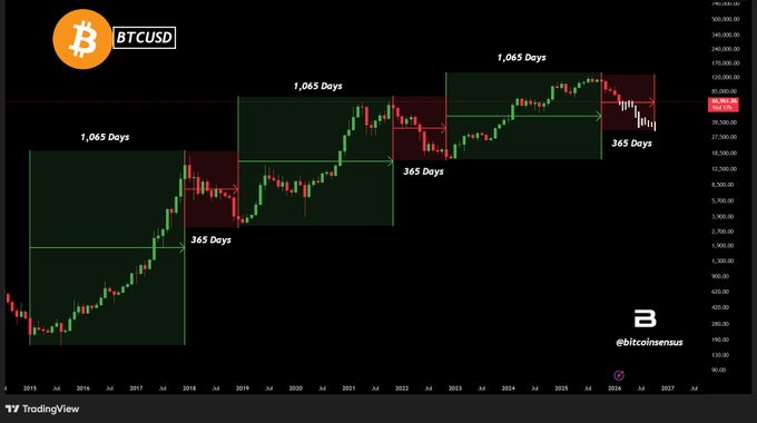 $BTC 365 天回档即将到来? 📉 比特币历史上曾出现约 1065 天的上涨行情… 随后回档约 365 天。 2015–2018 年:1065 天的上涨 → 1 年的回调 📉 2019–2022 年:同样的结构再次上演 2023–2025 年:我们是否又要进入回档阶段? 历史不会重演——但总是惊人地相似。 #比特币 #加密货币