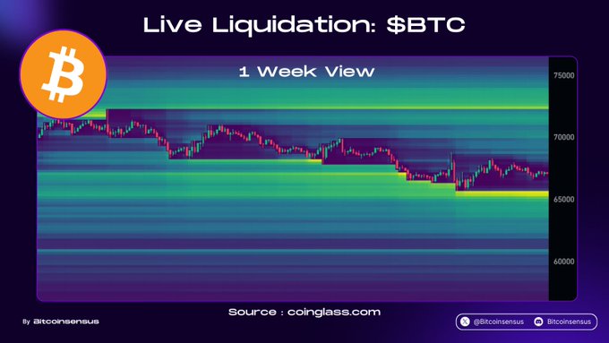 $BTC 流动性地图揭示陷阱🎯 一周清算热力图清晰可见。 72,000 美元至 75,000 美元上方聚集大量流动性 65,000 美元附近是密集清算区 价格在两股力量之间剧烈波动 流动性遭到掠夺。哪一方会先被吞噬? #比特币 #加密货币
