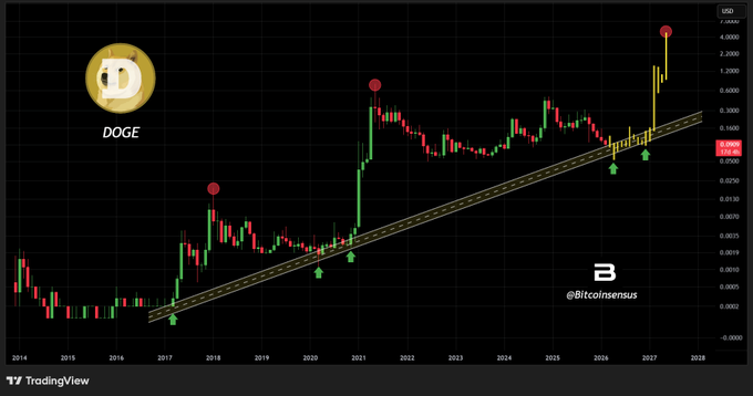 Dogecoin目前位于历史支撑位📈🎯 一条始于2017年的多年趋势线,现在起到了支撑作用。🔥 $DOGE