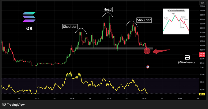 $SOL 突破头肩顶形态 🔥📉 下一个支撑位在 50-60 美元附近 🎯