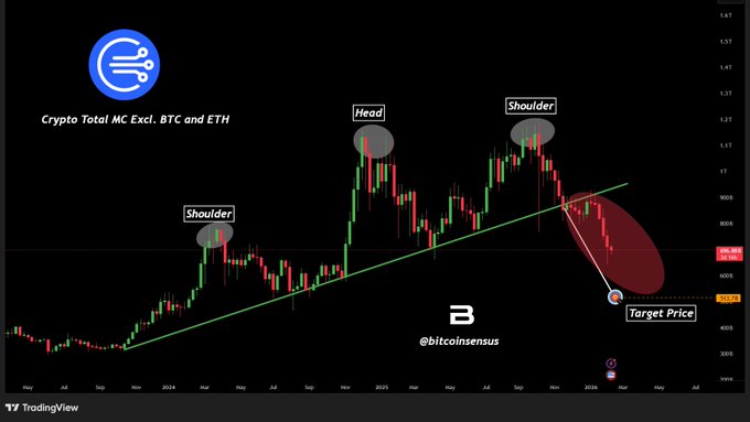 山寨币头肩形态分析📉 总市值(不包括BTC和ETH)证实了主要顶部形态的出现。 清晰的头脑和肩膀结构 趋势线突破已经开始。 🎯 衡量指标显示,目标约 5,130 亿美元 如果这种情况持续下去,山寨币可能会进一步下跌。 (NFA) #加密货币 #山寨币