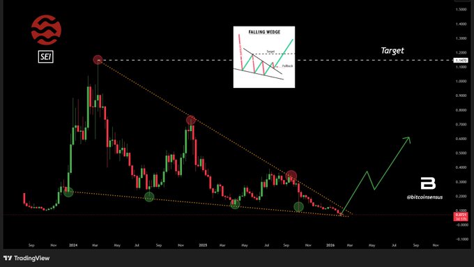 $SEI 落楔即将完工🚀 历时数月的压缩工作即将完成。 📉 一系列较低的高点形成阻力 📈 更高的低点守住了关键支撑位 需要成交量大幅突破才能看到趋势完全反转。 如果消息属实,目标价位在 1.14 美元左右。 (NFA) # Sei #加密货币