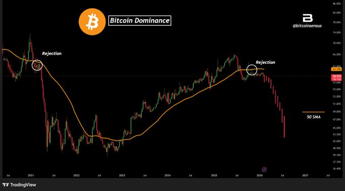 比特币主导地位再次遭到否决📉 BTC在 50 日均线处遭到拒绝——就像 2021 年一样。 阻力位明显降低 📉 被拒(NFA)后可能会出现严重的崩溃 #比特币 #加密货币