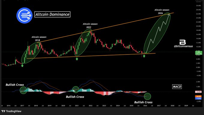 竞争币2026赛季即将开启?🚀 竞争币主导地位目前处于多年趋势线支撑位。 📈 此前的反弹(2018 年和 2022 年)引发了另类赛季 MACD 刚刚又出现了一个金叉。 结构看起来与前一周期低点完全相同。 #山寨币 #加密货币
