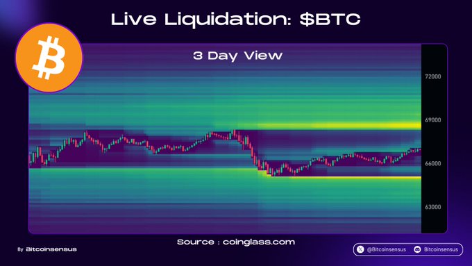$BTC 流动性地图设置 🔥 📍 主要清算集群位于 69,000 美元至 70,000 美元附近。 65,000 美元下方也存在大量流动性。 📈 价格刚刚触底——现在看来,上涨流动性就像磁铁一样吸引着它。 #比特币 #加密货币