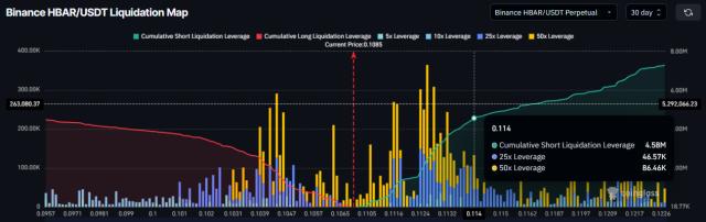 HBAR 空头主导交易:高于 0.114镁,面临 450 万镁的清算风险。