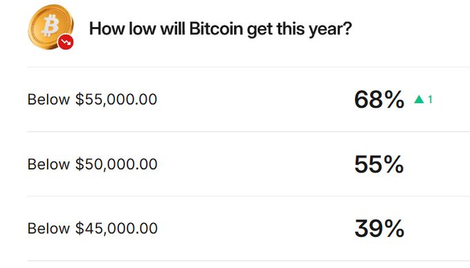 据 Kalshi 称,比特币今年有 68% 的概率跌破 5.5 万美元。