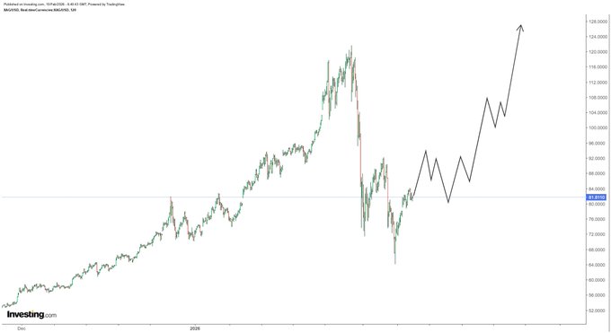 这就是我对白银价格走势的预期。首先可能会涨到 95 美元,然后回落到 85 美元,经历一段时间的震荡,之后再缓慢回升。方向尚不明朗,但预计会缓慢复苏……