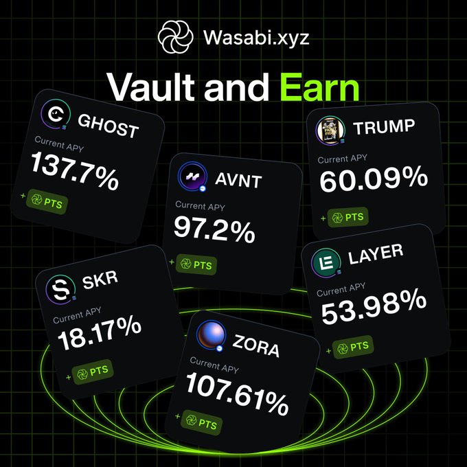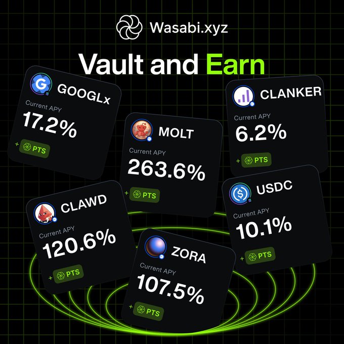 真实收益不应该很复杂。 Wasabi Vaults 让您从 $GOOGLx 和 $USDC 到突破性的 AI 元游戏(如 $CLANKER、$MOLT 和 $CLAWD)中赚取收益。 每个故事都有一个宝库。