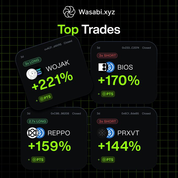 还在追逐那三支股票,却不明白为什么总是低卖高买? 本周的热门交易让你明白个中缘由。真正的机会都在链上。 方向无关紧要。 $WOJAK +221% $BIOS +170% $REPPO +159% $PRXVT +144% 你是在积极参与还是袖手旁观?